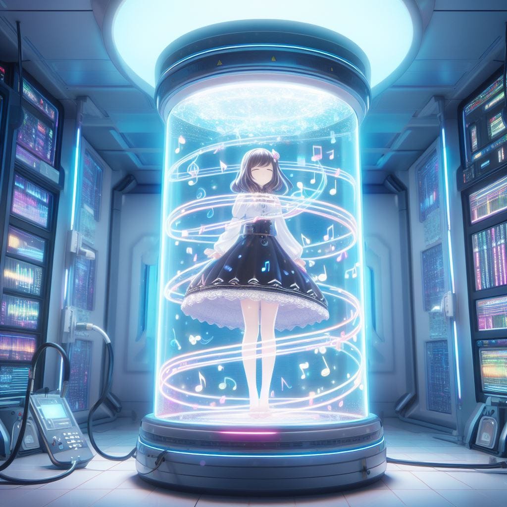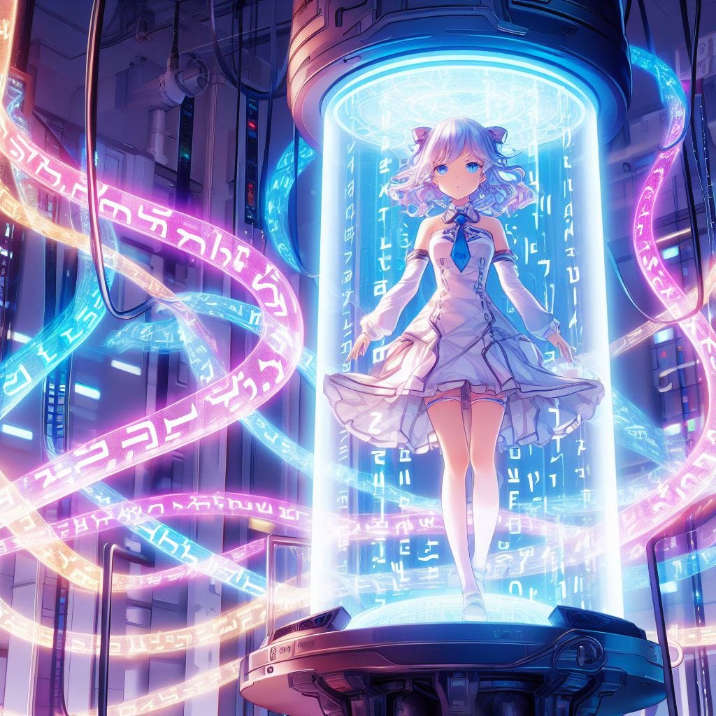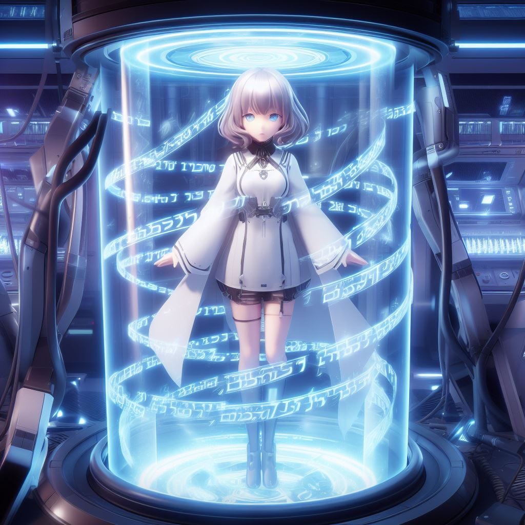 I used a number of text prompts to produce these, all variations of this: "anime woman standing in suspended animation tank that look like a light cylinder with swirling letters around her protecting her in a high tech laboratory." Different letter systems and musical notes were added as options. The below series of images is related.
