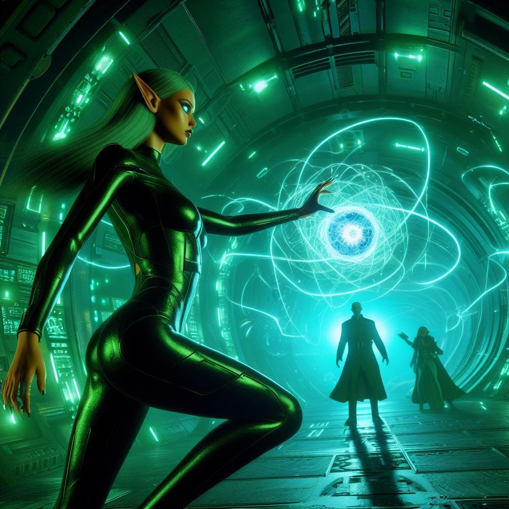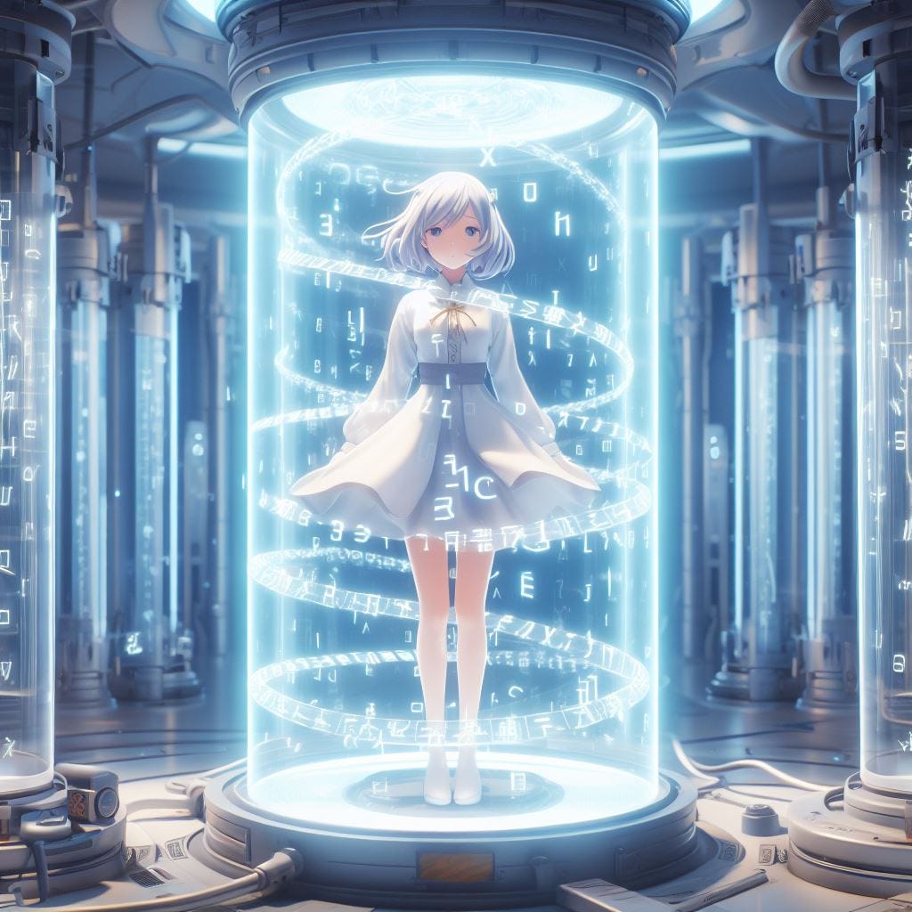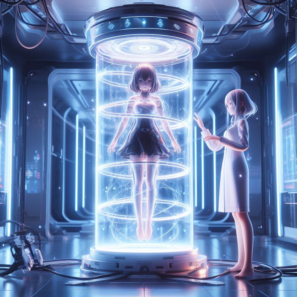 I used a number of text prompts to produce these, all variations of this: "anime woman standing in suspended animation tank that look like a light cylinder with swirling letters around her protecting her in a high tech laboratory." Different letter systems and musical notes were added as options. The below series of images is related.