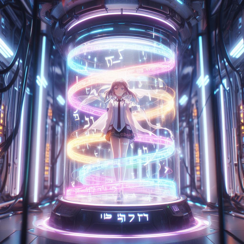 As you can see in the above image it is a Biblical sort of Hebrew letters swirling around a anime woman who is standing in a sort of womb-like cylinder of light that is like a suspended animation tank. The swirling letters represent a protection of songs, affirmations, prayers, and slogans. Other prompts were experimented with.